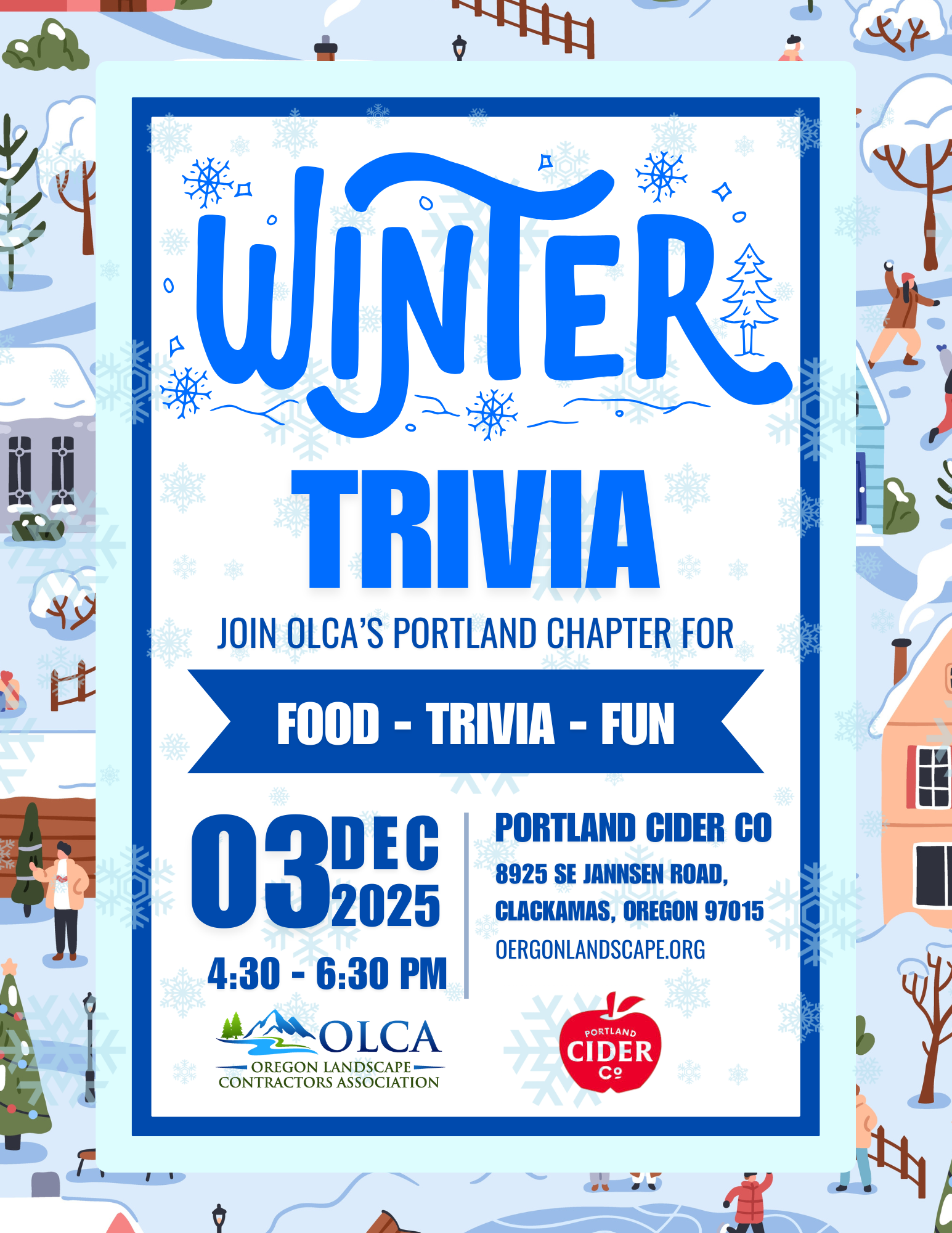 Join us for friendly competition, networking, and winter fun at the OLCA Portland Chapter Winter Trivia! Gather your team (or come solo and join one!) and show off your landscape know-how—and maybe some random facts too.